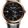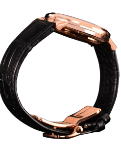 SpidoLite 黑色紋理小牛皮表帶,配玫瑰金縫線和針扣,可在 Reef Tiger 專有表帶系統(tǒng)內(nèi)互換。