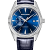 藍色表盤,帶棒狀標記。時、分、秒和日期顯示。這款奢華腕表的表盤 12 點鐘位置印有品牌標識。