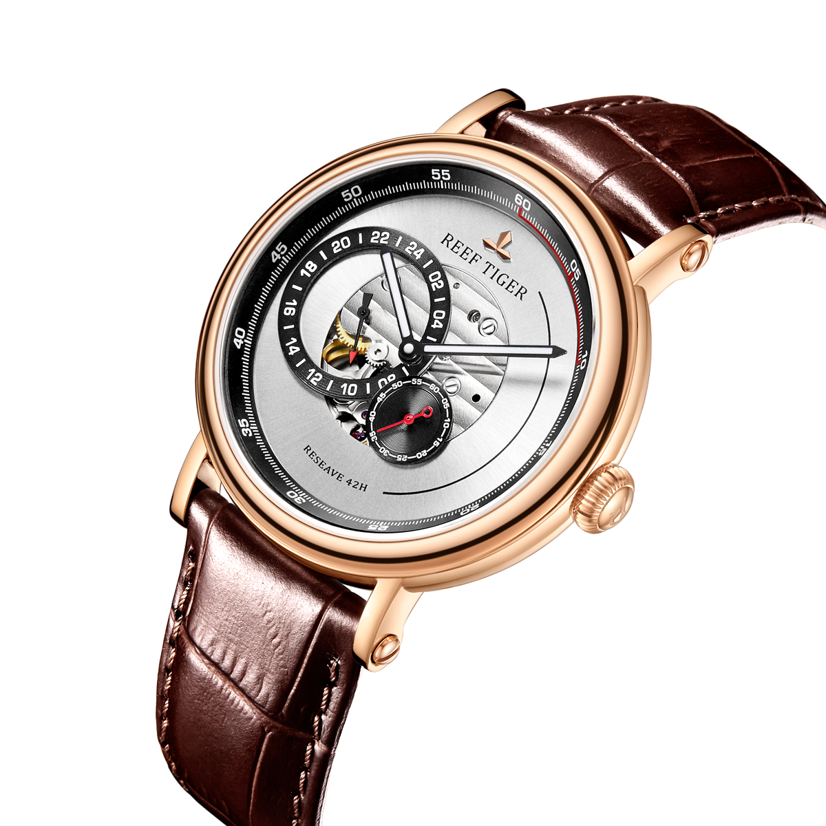 Reef Tiger Seattle Reserve 腕表。耐用的玫瑰金表圈,還配有玫瑰金表圈,打造專業(yè)的提案和演示。耐用的聚酯前后蓋,協(xié)調(diào)一致。