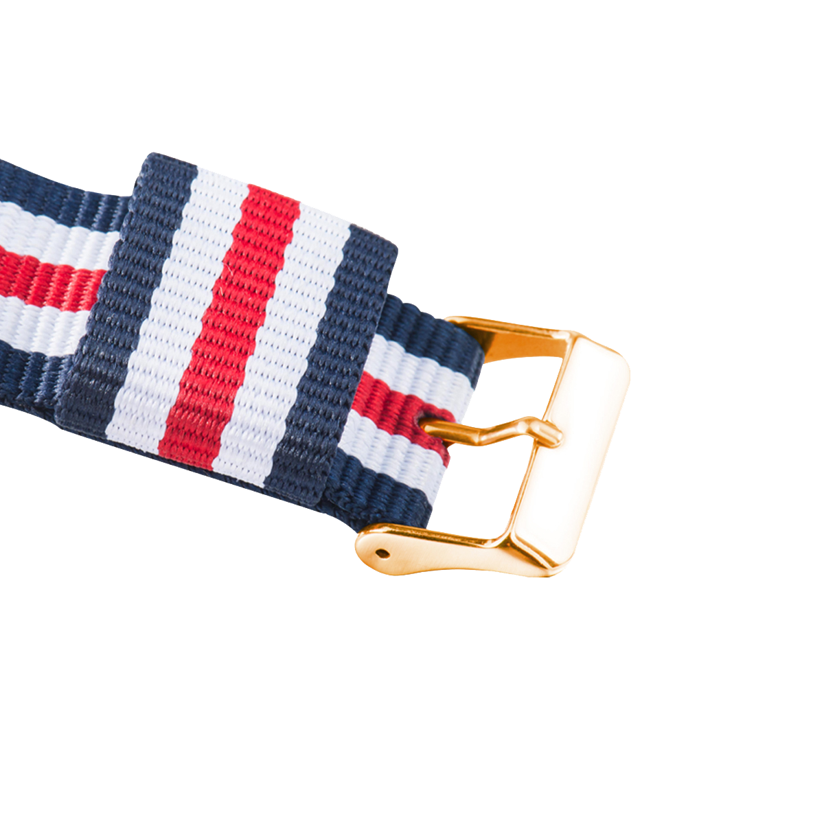 藍/綠色尼龍表帶,配以不銹鋼縫線和針扣,可在 Reef Tiger 專有表帶系統(tǒng)內互換。