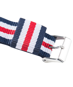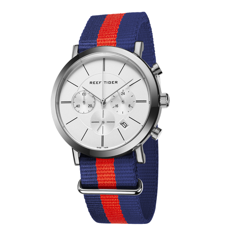 藍(lán)/紅色尼龍表帶,配有不銹鋼縫線和針扣,可在 Reef Tiger 專有表帶系統(tǒng)內(nèi)互換。