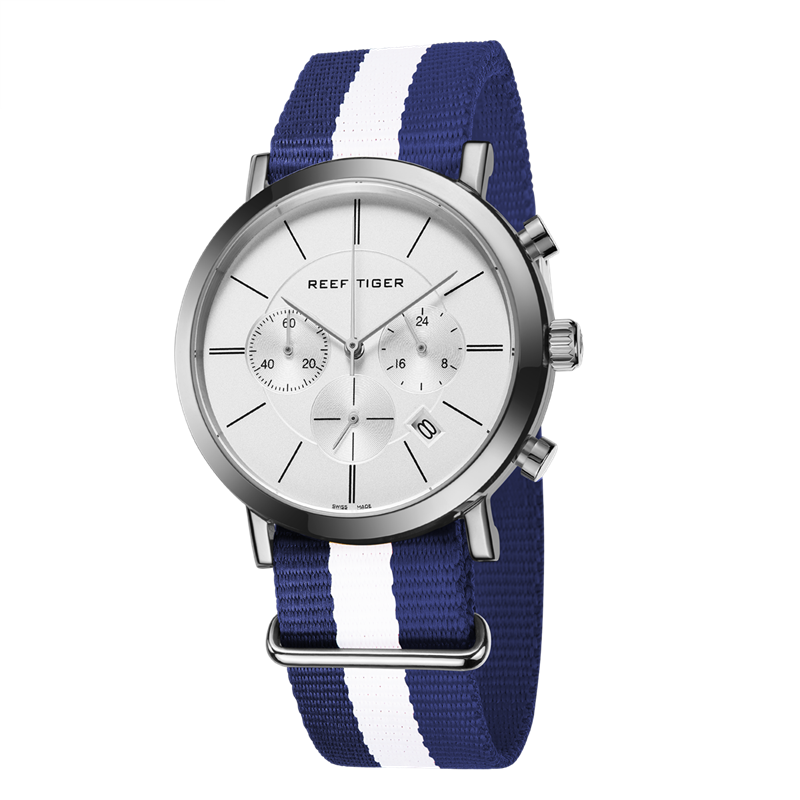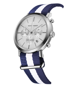 藍/白色尼龍表帶,配有不銹鋼縫線和針扣,可在 Reef Tiger 專有表帶系統(tǒng)內互換。