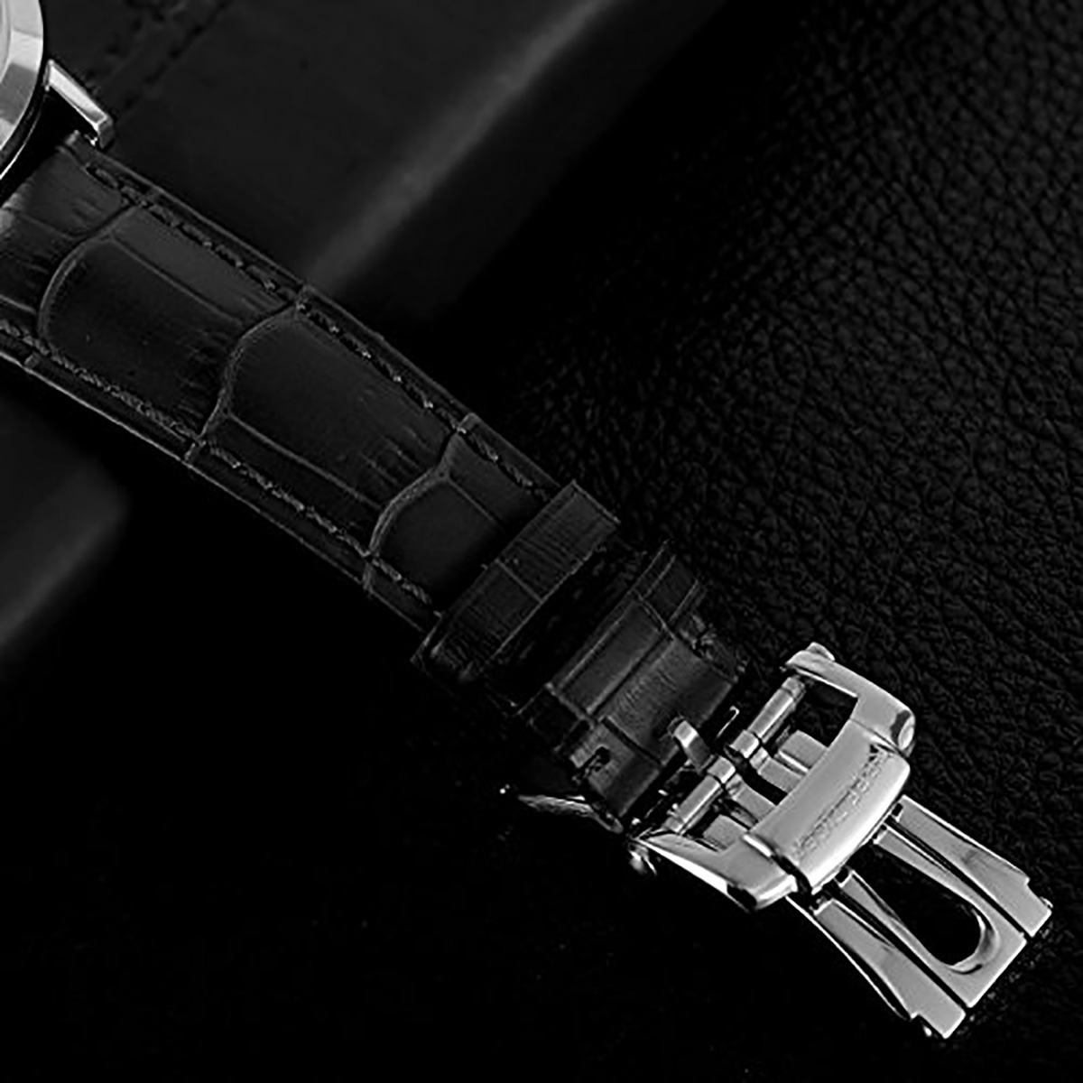 黑色表盤帶棒狀標記。時、分、秒、日期和動力儲備顯示。這款豪華手表的標志位于表盤 12 點鐘位置。