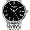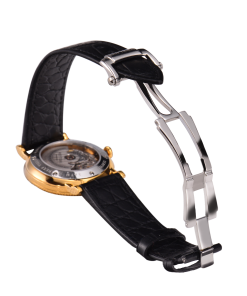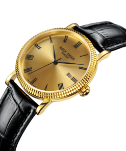 香檳色表盤,帶黑色羅馬數(shù)字標(biāo)記。小時(shí)和分鐘顯示。這款時(shí)尚的男士手表在表盤 12 點(diǎn)鐘位置印有其標(biāo)志。