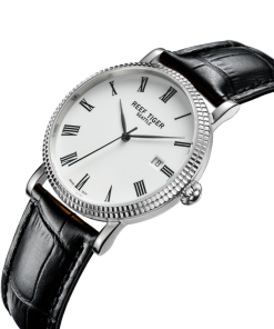 白色表盤,帶羅馬數(shù)字標(biāo)記。時(shí)、分、秒和日期顯示。這款時(shí)尚的男士手表在表盤 12 點(diǎn)鐘位置有其標(biāo)志。
