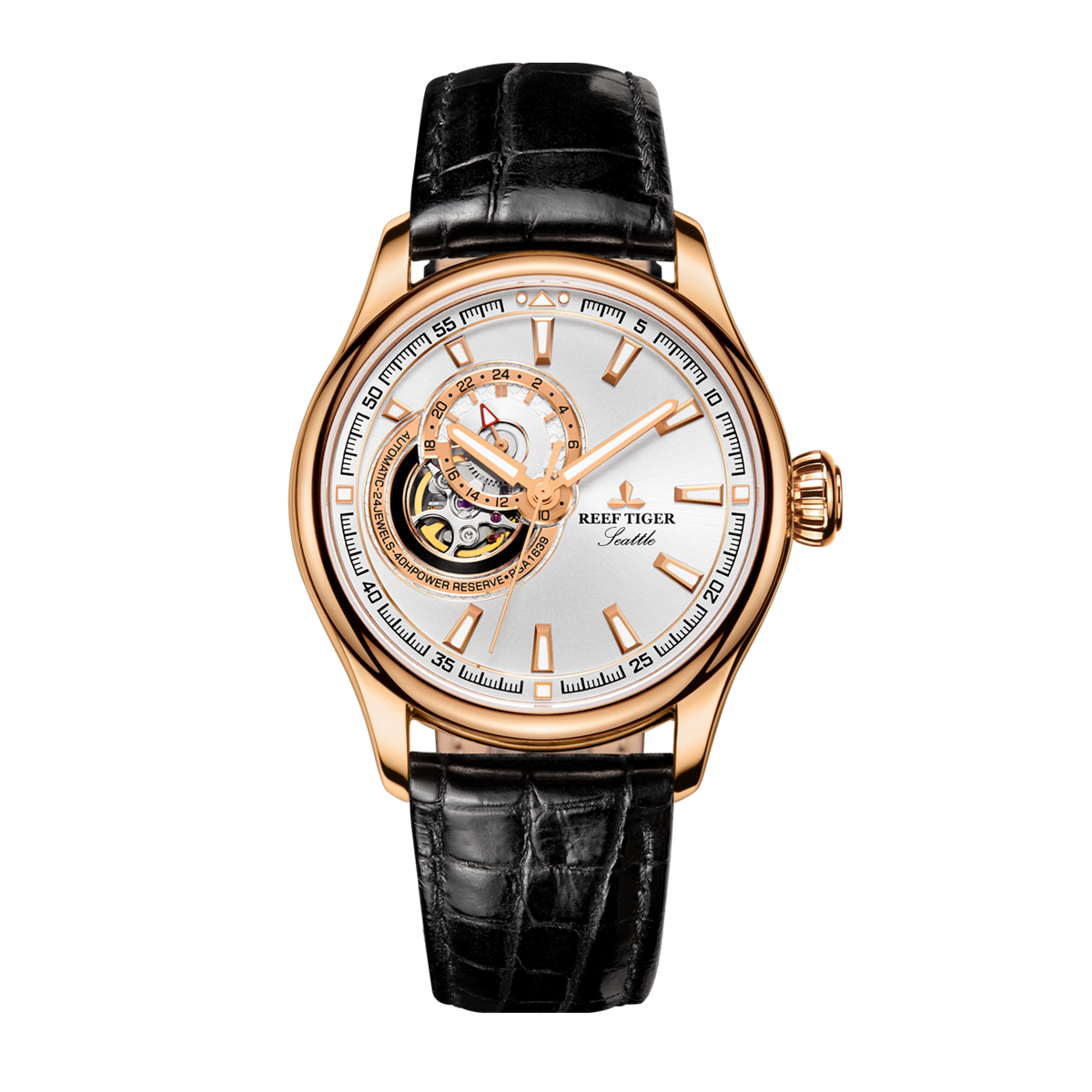該款腕表表殼采用精鋼材質(zhì),局部鍍玫瑰金,表殼尺寸為44mm,延續(xù)了瑞夫泰格西雅圖腕表的簡(jiǎn)潔線條。表耳設(shè)計(jì)精致和諧,其弧度符合人體工學(xué)設(shè)計(jì),確保佩戴舒適。
