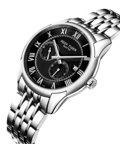 黑色表盤,帶羅馬數字標記。時、分、秒和日期顯示。這款時尚的男士手表在表盤 12 點鐘位置印有其標志。