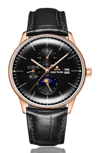 黑色表盤搭配玫瑰金色棒狀標記。時、分、秒、星期、日期和月相顯示。這款奢華腕表的表盤 3 點鐘位置印有品牌標識。