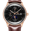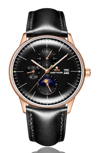 黑色表盤(pán)搭配玫瑰金色棒狀標(biāo)記。時(shí)、分、秒、星期、日期和月相顯示。這款奢華腕表的表盤(pán) 3 點(diǎn)鐘位置印有品牌標(biāo)識(shí)。