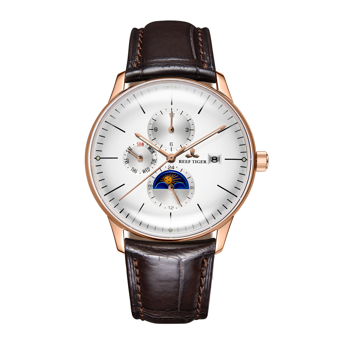 白色表盤,帶玫瑰金色棒狀標(biāo)記。時(shí)、分、秒、星期、日期和月相顯示。這款奢華腕表的表盤 3 點(diǎn)鐘位置印有品牌標(biāo)識。
