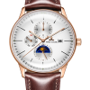 白色表盤,帶玫瑰金色棒狀標記。時、分、秒、星期、日期和月相顯示。這款奢華腕表的表盤 3 點鐘位置印有品牌標識。