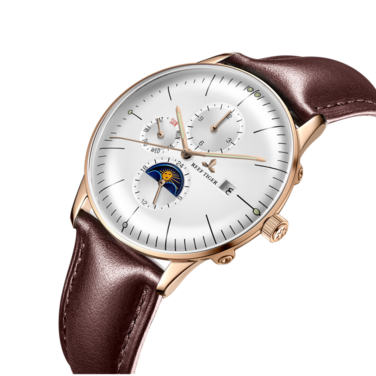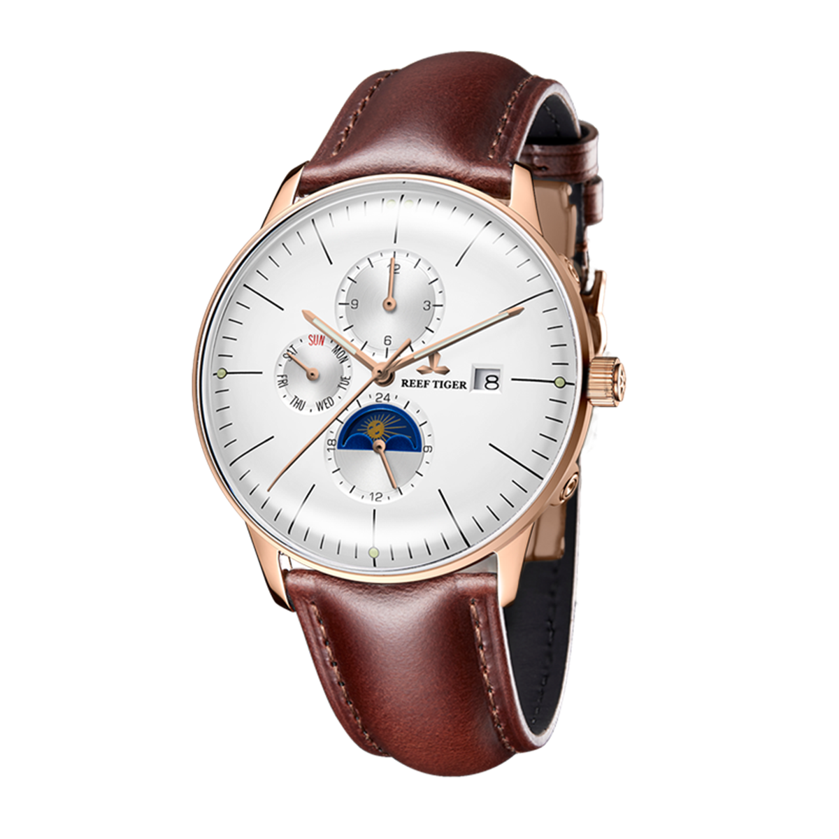 白色表盤,帶玫瑰金色棒狀標(biāo)記。時、分、秒、星期、日期和月相顯示。這款奢華腕表的表盤 3 點鐘位置印有品牌標(biāo)識。