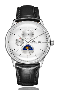 白色表盤,帶銀色棒狀標(biāo)記。時、分、秒、星期、日期和月相顯示。這款奢華腕表的表盤 3 點鐘位置印有品牌標(biāo)識。
