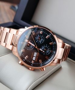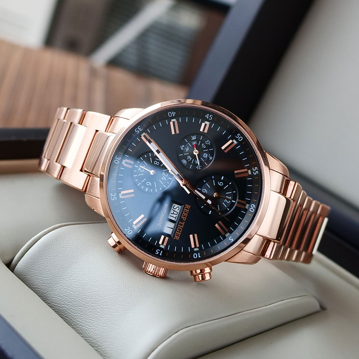 黑色表盤,帶銀色棒狀標(biāo)記。小時、分鐘、秒、星期、日期 這款奢華腕表的表盤 3 點鐘位置印有品牌標(biāo)識。