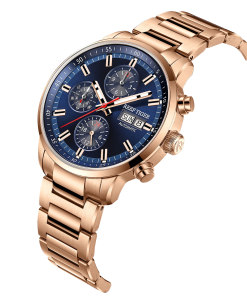 藍色表盤,帶銀色棒狀標(biāo)記。小時、分鐘、秒、星期、日期 這款奢華腕表的表盤 3 點鐘位置印有品牌標(biāo)識。