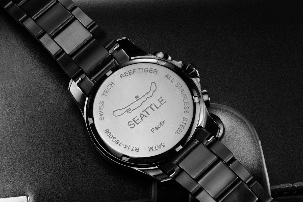 西雅圖太平洋計(jì)時(shí)腕表。耐用的不銹鋼鍍黑色 DLC,固定表圈也配有打造專業(yè)外觀的提案和演示。耐用的聚酯前后蓋,協(xié)調(diào)一致。