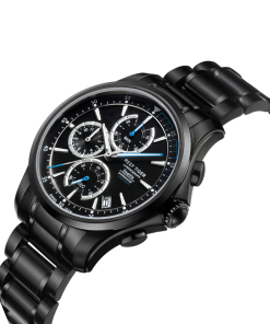 黑色表盤帶棒狀標(biāo)記。計時碼表、小時、分鐘、秒和日期顯示。這款豪華腕表在表盤 3 點(diǎn)鐘位置有其標(biāo)志。