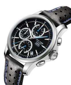 黑色表盤帶棒狀標記。計時碼表、小時、分鐘、秒和日期顯示。這款豪華手表的表盤 3 點鐘位置印有其標志。
