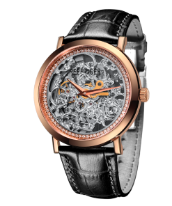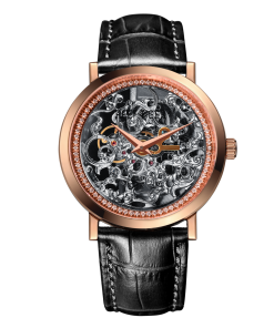 鏤空表盤鑲嵌鉆石。小時和分鐘顯示。這款時尚的男士手表在表盤 12 點鐘位置印有其標志。