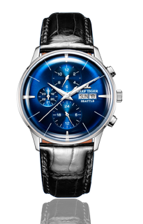 藍色表盤,帶棒狀標記。時、分、秒、日期和星期顯示。這款奢華腕表的表盤 3 點鐘位置印有品牌標識。