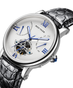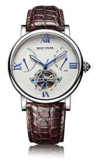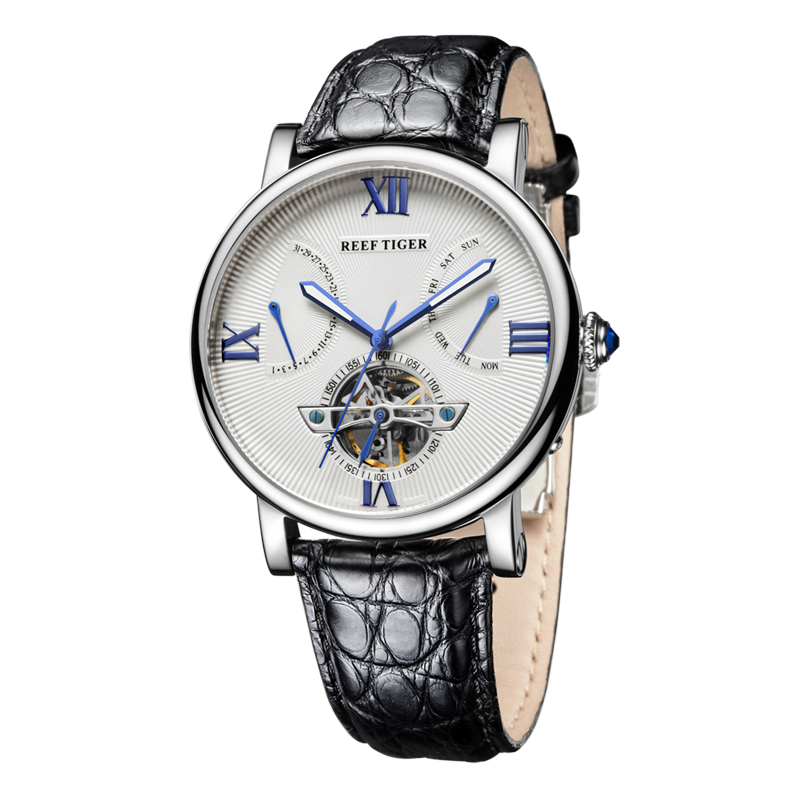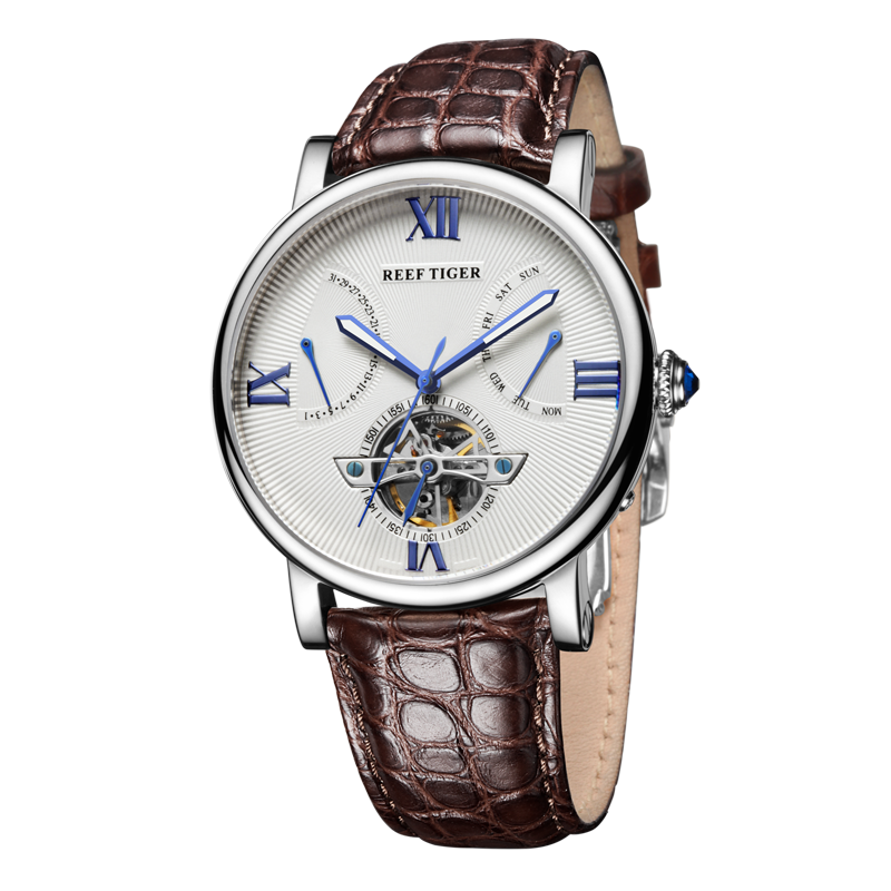 水波紋白色表盤(pán),羅馬數(shù)字時(shí)標(biāo),搭配飛輪、星期和日期顯示,映射成熟智慧。