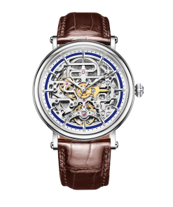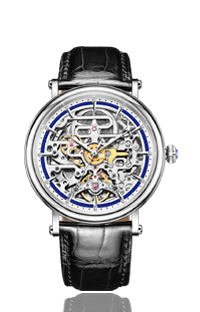 鏤空表盤,帶鉆石/棒狀標(biāo)記。小時(shí)、分鐘顯示。這款奢華腕表的表盤 12 點(diǎn)鐘位置印有其標(biāo)志。
