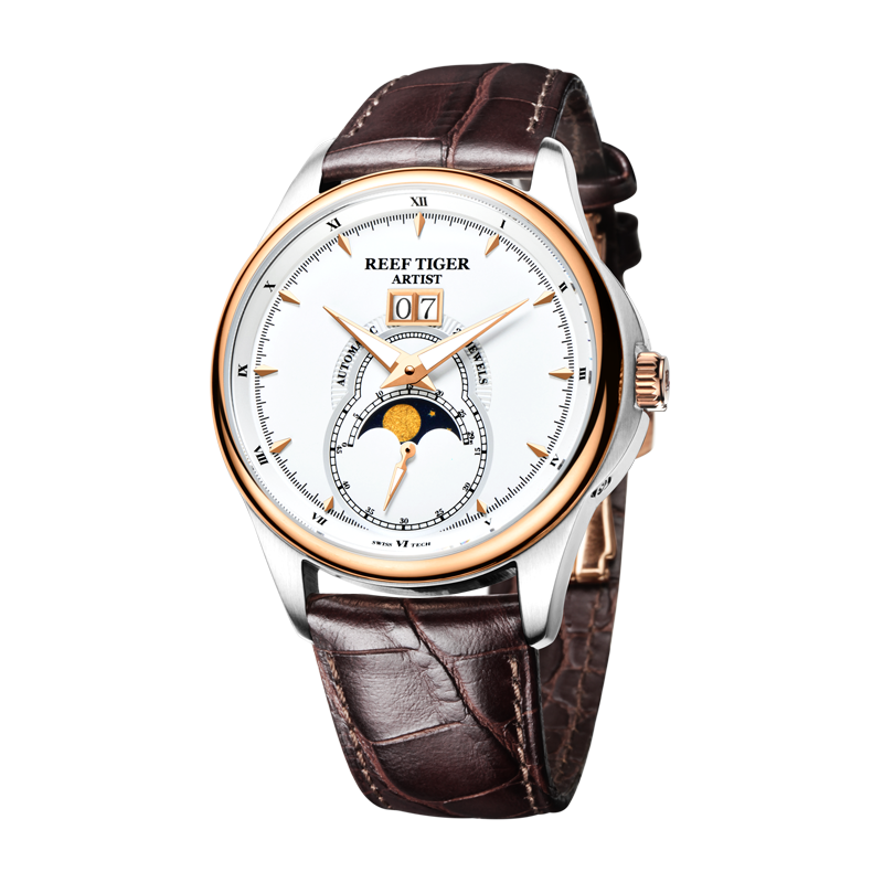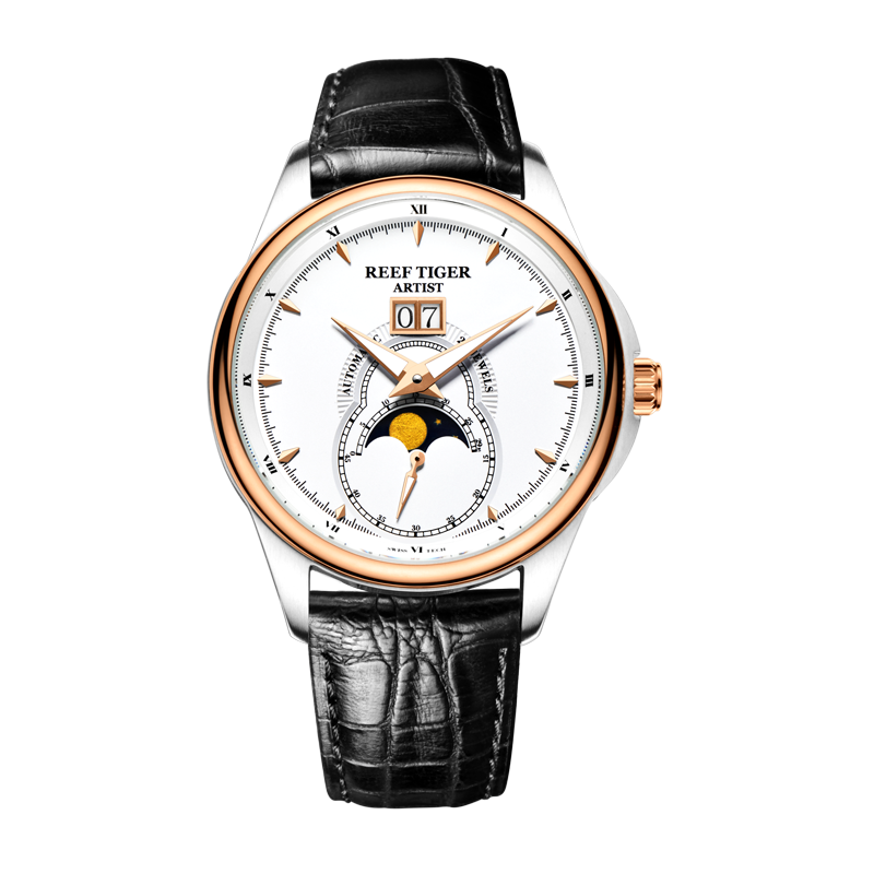 白色表盤搭配玫瑰金色棒狀標(biāo)記。時(shí)、分、秒、雙日歷和月相顯示。這款豪華手表在表盤 12 點(diǎn)鐘位置有其標(biāo)志。