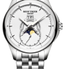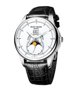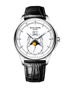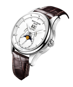 白色表盤,銀色調(diào)棒狀標(biāo)記。時、分、秒、雙日歷和月相顯示。這款奢華腕表在表盤 12 點鐘位置印有其標(biāo)志。