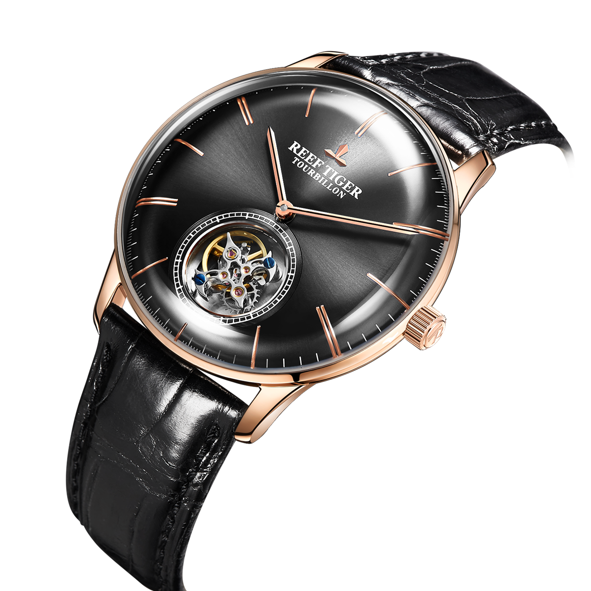 Reef Tiger Seattle 陀飛輪腕表。耐用的玫瑰金表圈,還配有玫瑰金表圈,打造專業(yè)的提案和演示。耐用的聚酯前后蓋,協(xié)調(diào)一致。