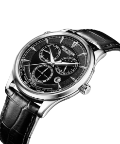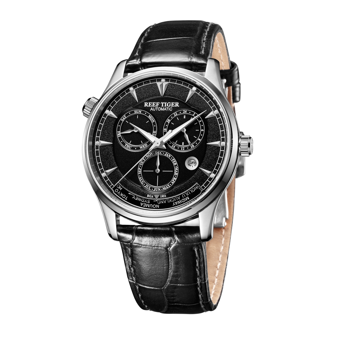 黑色表盤,帶棒狀標(biāo)記。日期指示器顯示在表盤的 10 點(diǎn)鐘位置??梢允褂觅?gòu)買的腕表的免費(fèi)工具調(diào)整日期。當(dāng)腕表上弦時(shí),動(dòng)力儲(chǔ)存至少可達(dá)到 40 小時(shí)。RT7151 自動(dòng)機(jī)芯的動(dòng)力儲(chǔ)存約為 48 小時(shí)。24 小時(shí)指示,指針顯示在 2 點(diǎn)鐘位置。您可以按下表殼上 2:00 處的按鈕進(jìn)行調(diào)整。但請(qǐng)不要在晚上 8:30 至次日凌晨 3:30 之間調(diào)整,因?yàn)樵诖似陂g星期功能正在更改。月份指示子表盤顯示在 6 點(diǎn)鐘位置。此外,此子表盤下方還顯示世界時(shí)間指示器。Reef Tiger Geographer 系列手表提供兩種款式可供選擇,包括不銹鋼款和玫瑰金款。