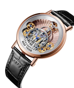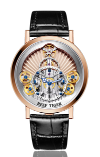 鏤空表盤搭配銀色內(nèi)圈。 Reef Tiger Rotation 腕表采用傳統(tǒng)的鏤空藝術(shù)家設(shè)計(jì),通過空間和三維展示腕表的美感和獨(dú)特性。鏤空、雕花等復(fù)雜元素的運(yùn)用與傳統(tǒng)制表工藝的古典裝飾藝術(shù)相得益彰。