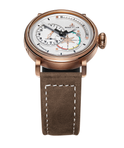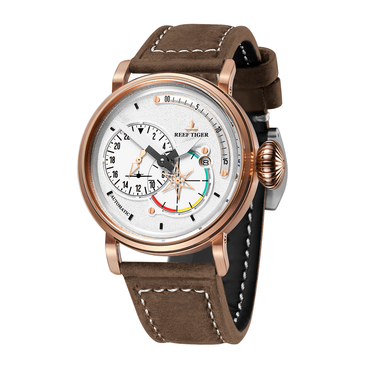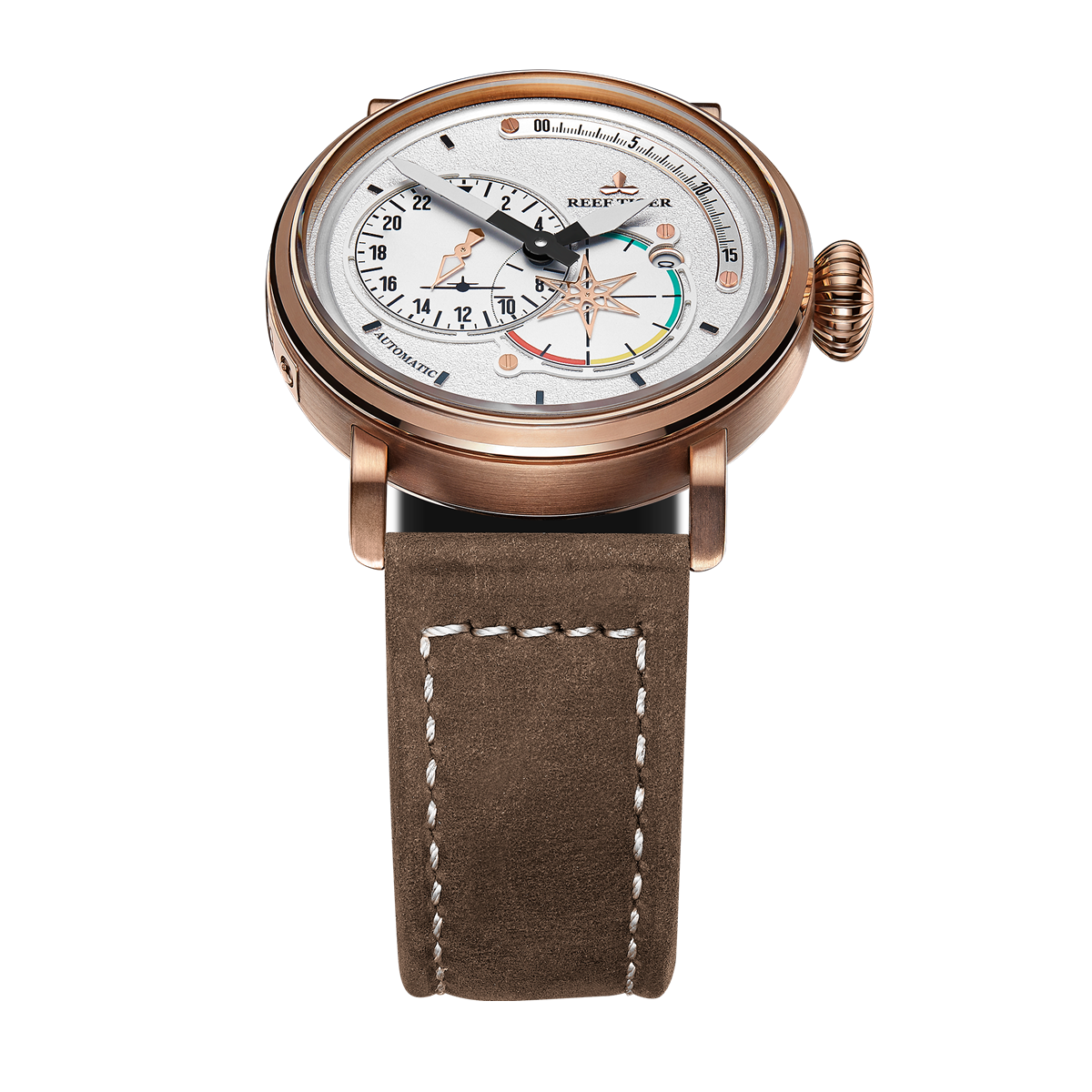Aurora Pilot 腕表。耐用的不銹鋼表殼鍍有玫瑰金,還配有打造專業(yè)外觀的提案和演示。耐用的聚酯前后蓋與協(xié)調(diào)。