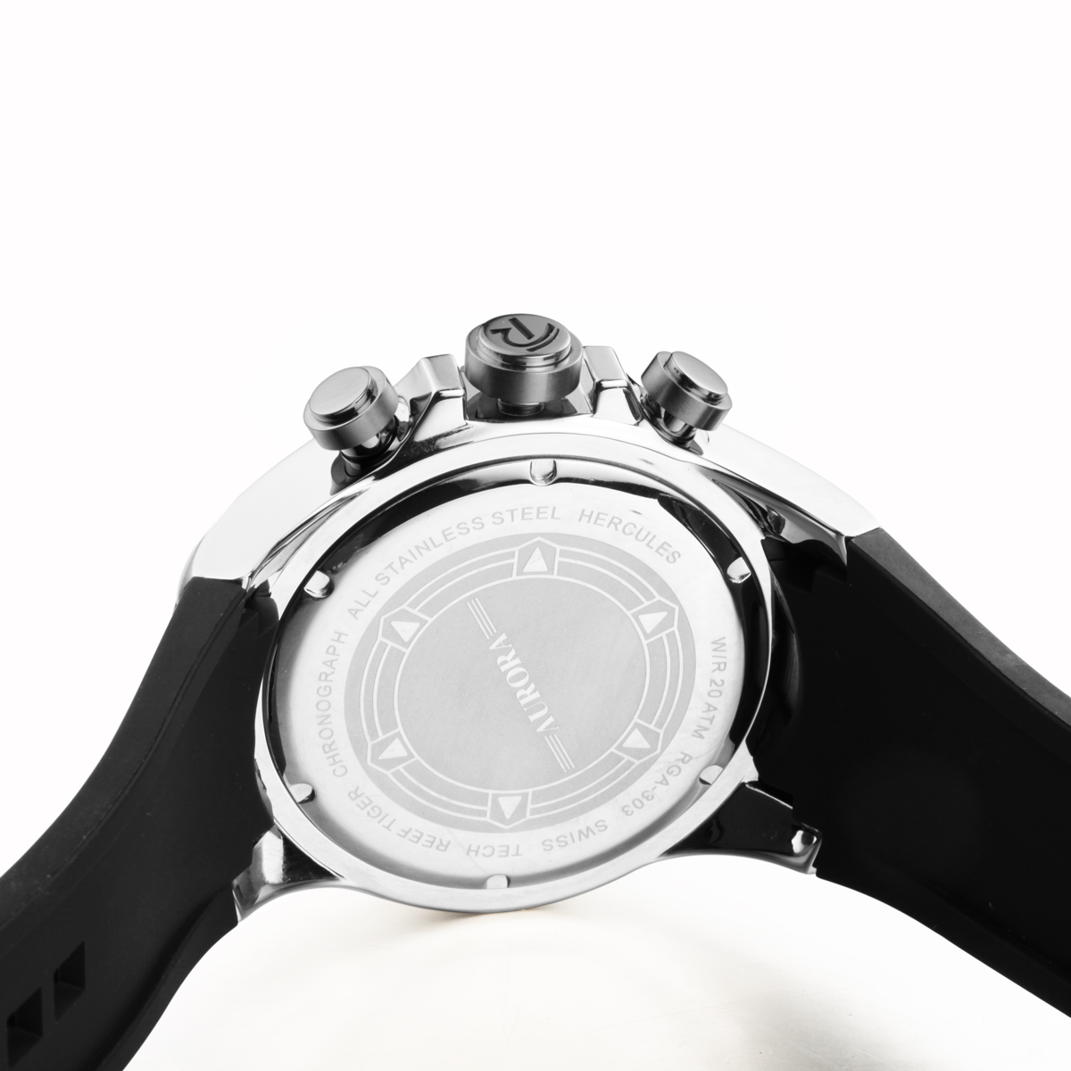 Aurora Hercules 計(jì)時(shí)腕表。耐用的不銹鋼固定表圈還配有可打造專業(yè)外觀的提案和演示。耐用的聚酯前后蓋,協(xié)調(diào)一致。