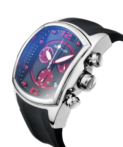 黑色表盤,紅色標(biāo)記和大型夜光指針。計時碼表、時、分、秒和日期顯示。這款豪華手表的表盤 12 點鐘位置印有其標(biāo)志。
