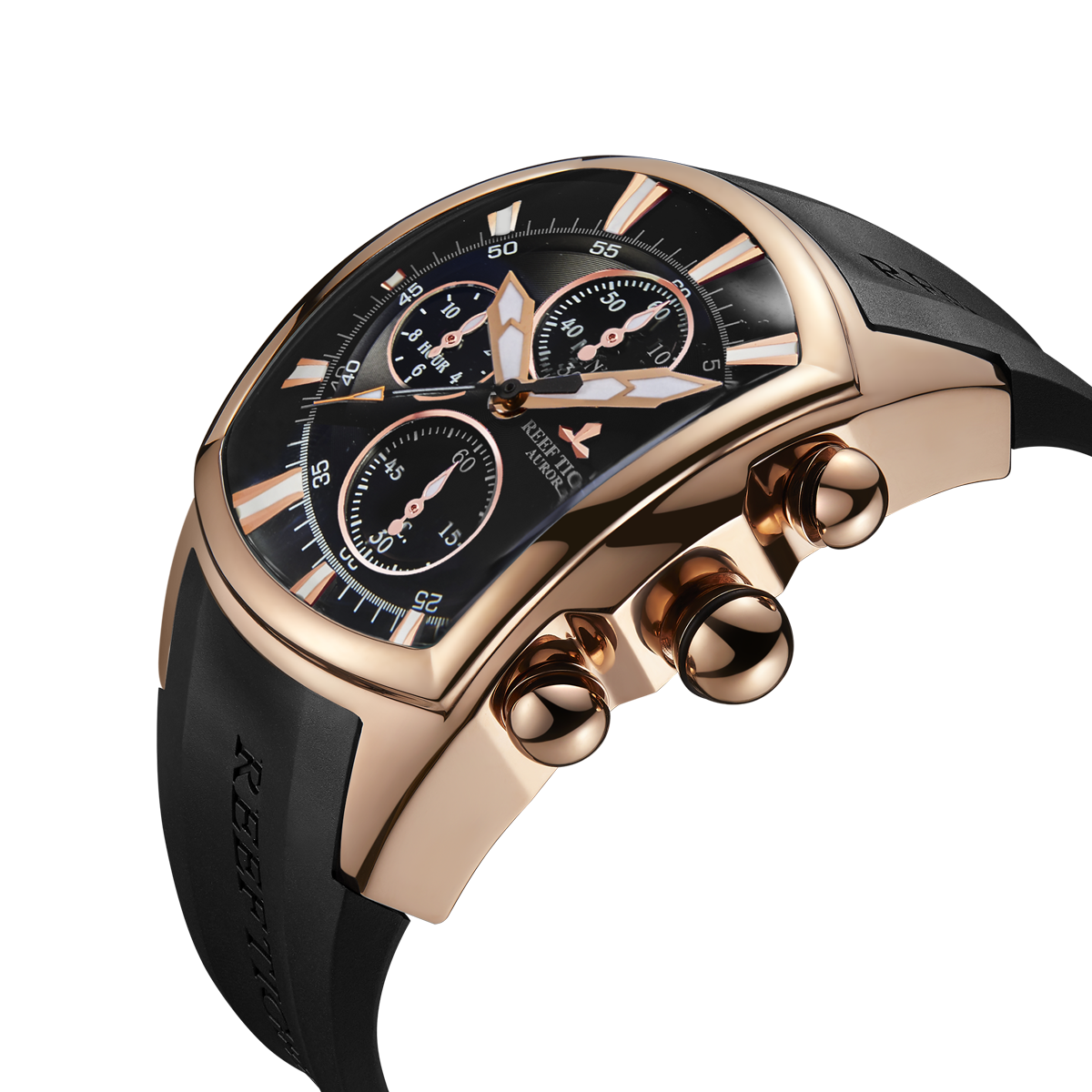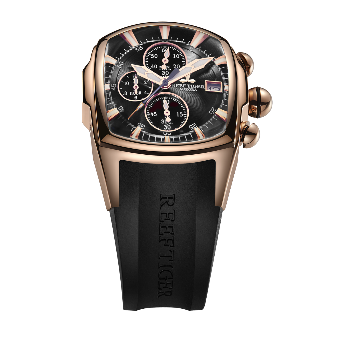 Aurora Tank T 男士手表。耐用的不銹鋼鍍玫瑰金,固定表圈也配有打造專業(yè)外觀的提案和演示。耐用的聚酯前后蓋,協(xié)調(diào)一致。