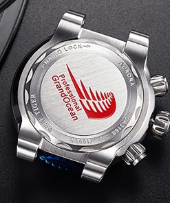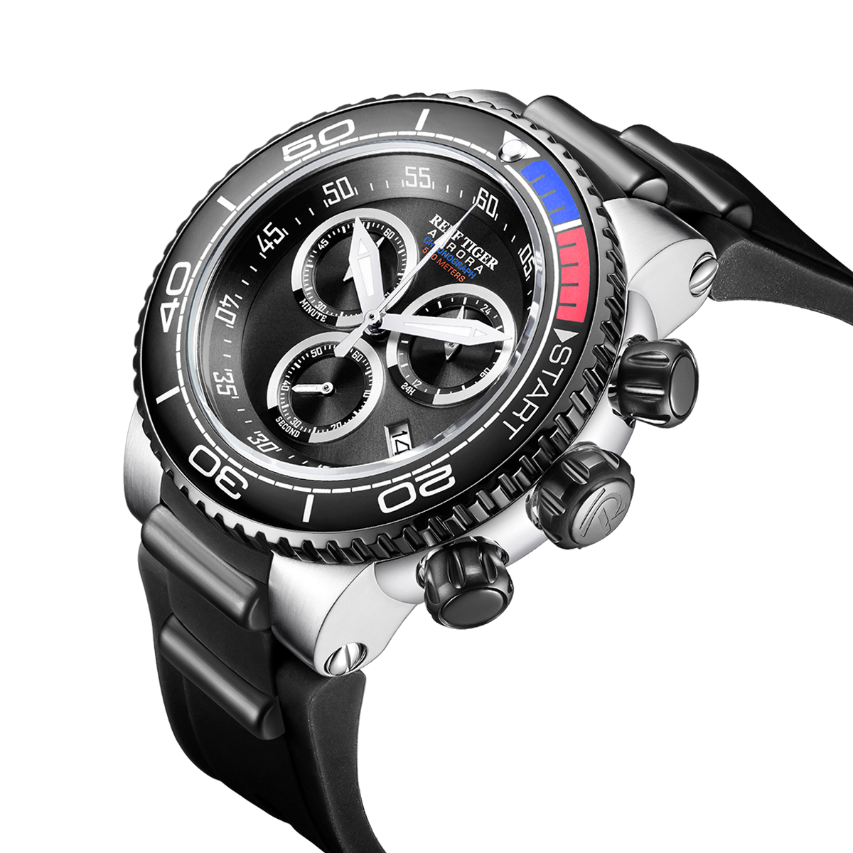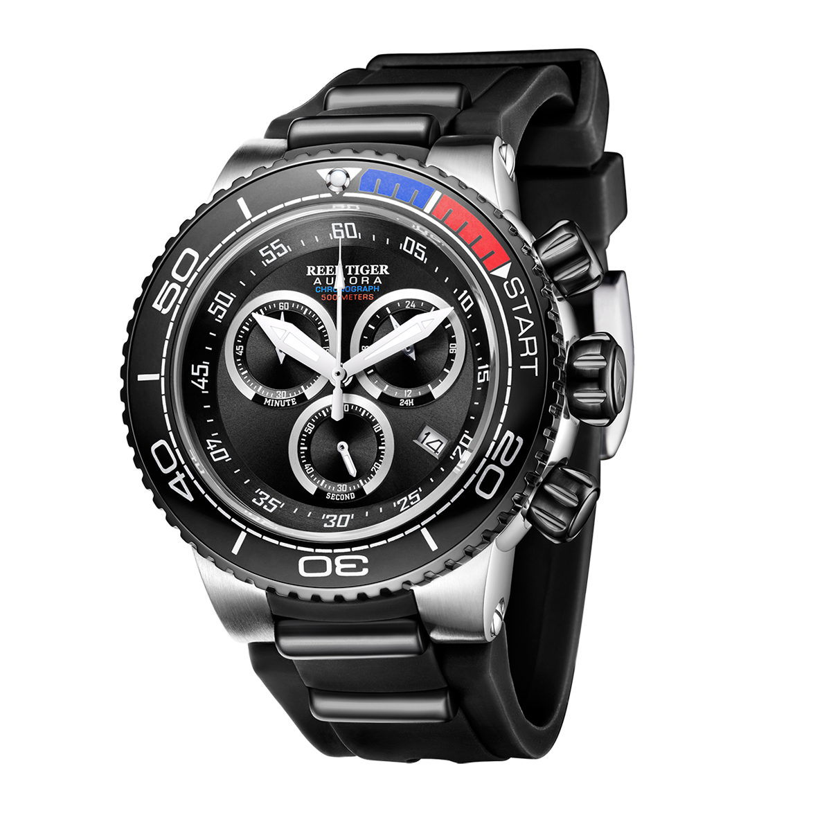 Reef Tiger Aurora Grand Ocean 腕表。耐用的鋼質(zhì)表圈還配有專業(yè)級(jí)的提案和演示。耐用的聚酯前后蓋與表盤相得益彰。