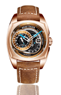 Reef Tiger Aurora Pioneer 腕表。耐用的玫瑰金表圈,還配有玫瑰金表圈,打造專業(yè)的提案和演示。耐用的聚酯前后蓋,協(xié)調一致。