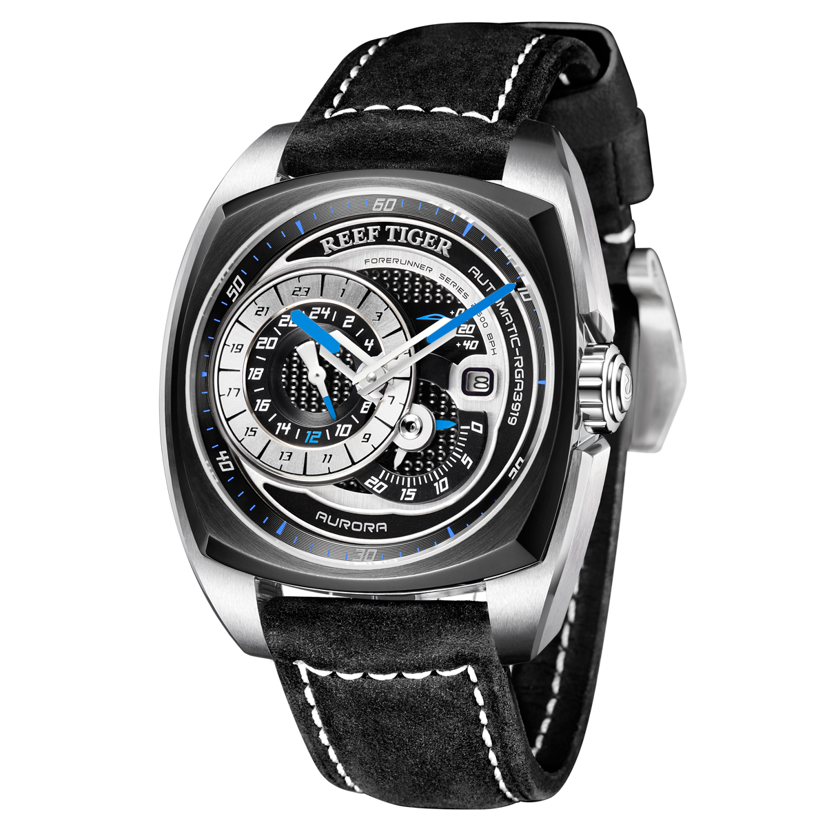 Reef Tiger Aurora Pioneer 腕表。耐用的鋼/pvd 表圈,鋼/pvd 表圈還配有專業(yè)提案和演示。耐用的聚酯前后蓋,協(xié)調(diào)一致。