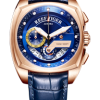 藍(lán)色表盤,帶圓點標(biāo)記。計時碼表、小時、分鐘、秒和日期顯示。這款奢華腕表的表盤 12 點鐘位置印有品牌標(biāo)識。