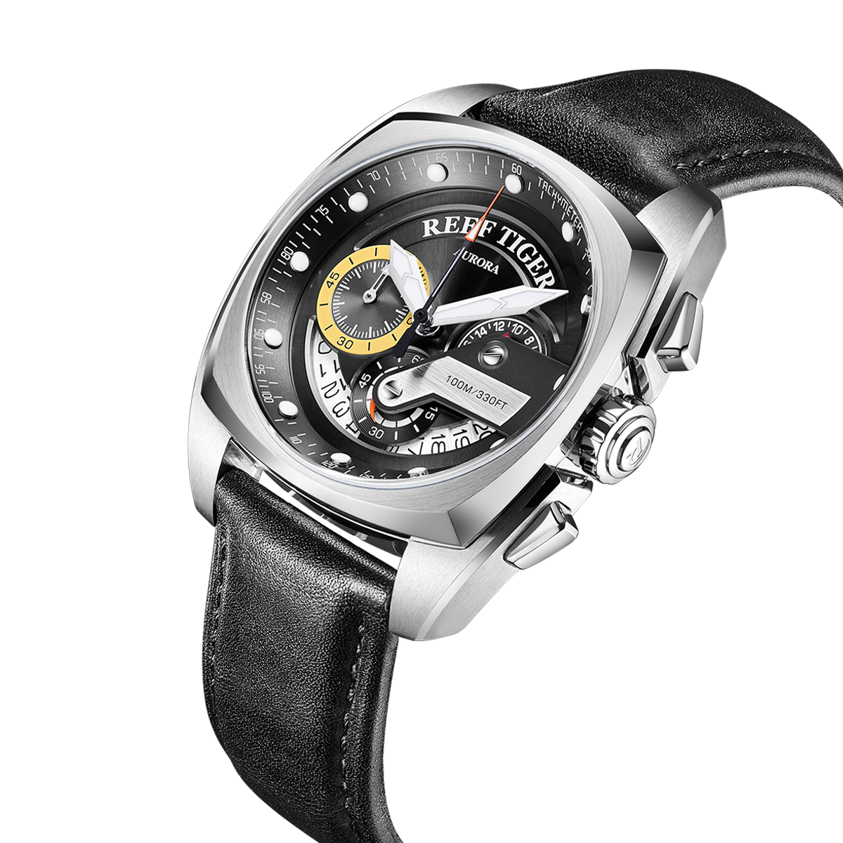 Reef Tiger Aurora Formula Race 腕表。耐用的鋼質(zhì)表圈還配有專業(yè)級的提案和演示。耐用的聚酯前后蓋與表盤相得益彰。