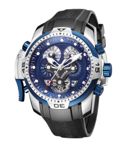 藍(lán)色表盤(pán),帶兩個(gè)子表盤(pán)。 陀飛輪框架顯示在 6 點(diǎn)鐘位置,年份和月份顯示在 12:00 位置,星期顯示在 9.00 位置,日期顯示在 3.00 位置。