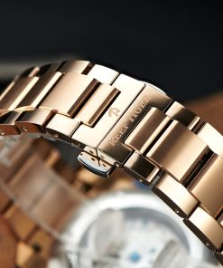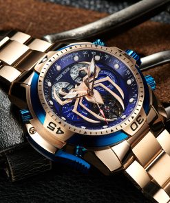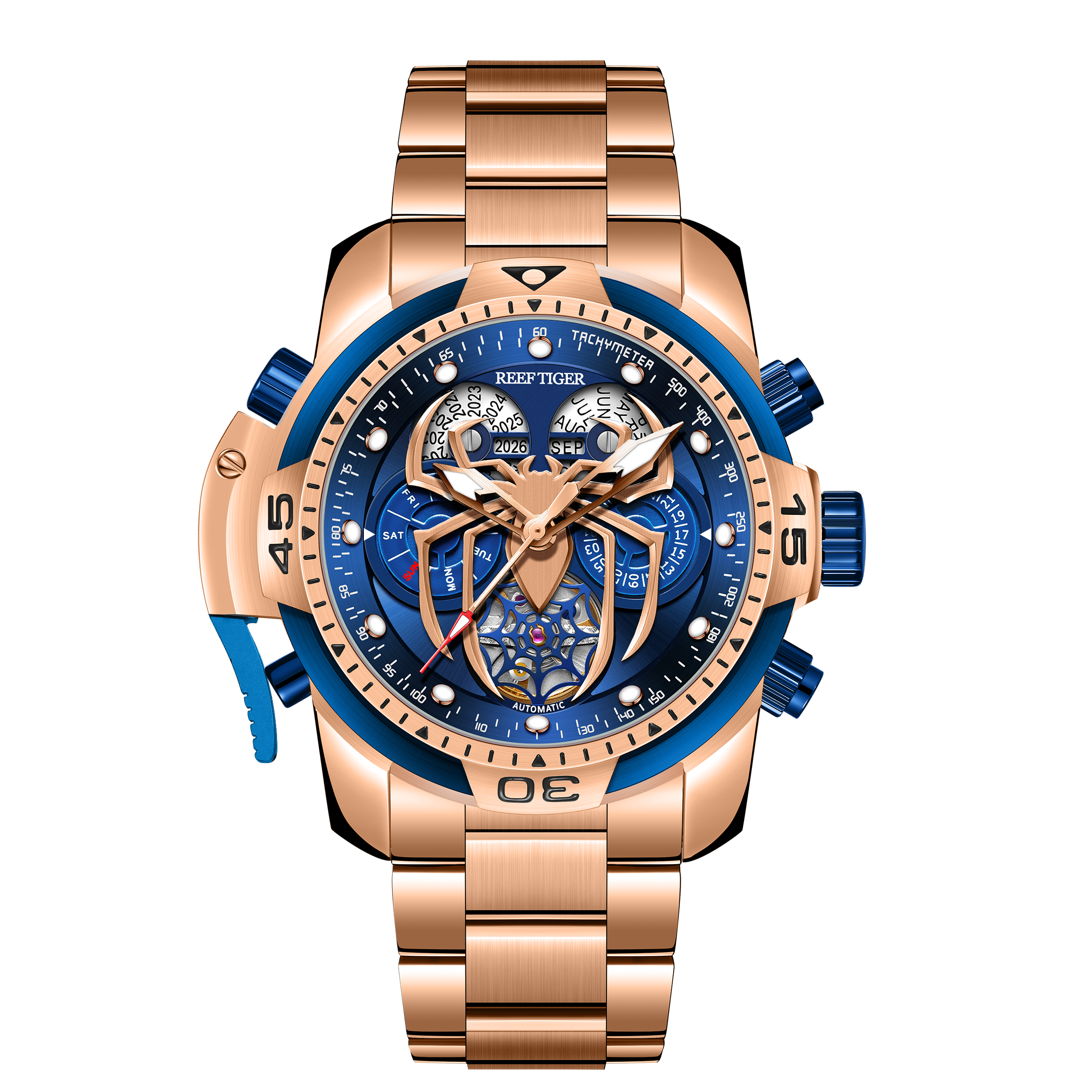 藍(lán)色表盤搭配玫瑰金蜘蛛。 12:00 顯示年份和月份,9.00 顯示星期,3.00 顯示日期。