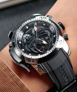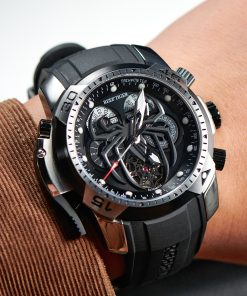 黑色表盤搭配黑色蜘蛛。 12:00 顯示年份和月份,星期9 點(diǎn)位置,3 點(diǎn)位置顯示日期。