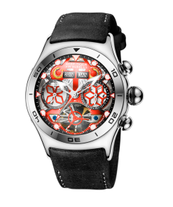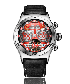 鏤空表盤,帶兩個(gè)子表盤。 12 點(diǎn)鐘位置有兩個(gè)年份和月份窗口。陀飛輪顯示位于 6 點(diǎn)鐘位置,星期顯示位于 3 點(diǎn)鐘位置,日期顯示位于 9 點(diǎn)鐘位置。