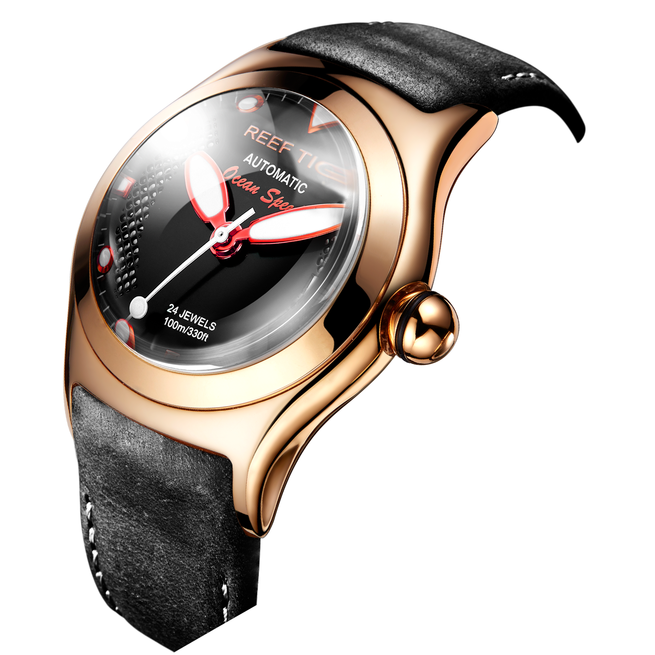 Aurora Ocean Speed Automatic 手表。耐用的不銹鋼鍍玫瑰金,固定表圈也配有打造專(zhuān)業(yè)外觀的提案和演示。耐用的聚酯前后蓋與協(xié)調(diào)。