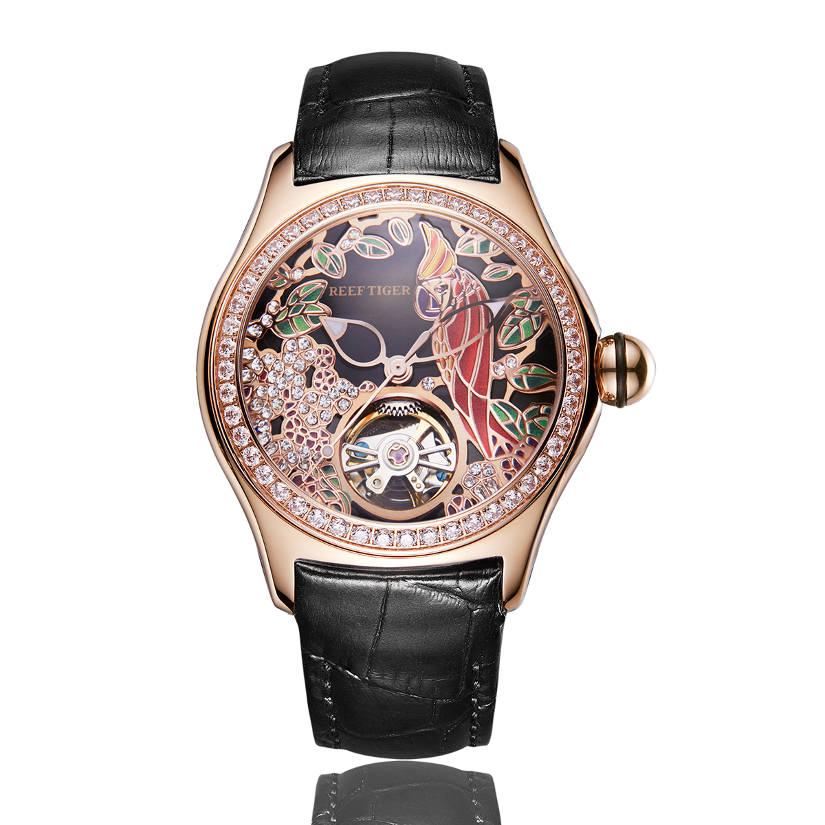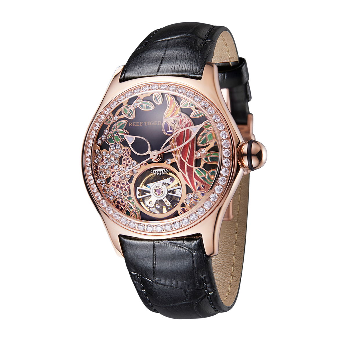 Reef Tiger Aurora 鸚鵡腕表。耐用的玫瑰金表圈,玫瑰金鉆石表圈還配有打造專業(yè)外觀的提案和演示。耐用的聚酯前后蓋,協(xié)調(diào)一致。