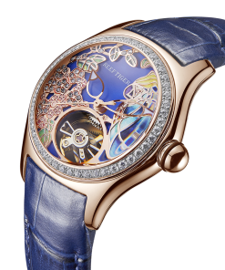 藍色表盤,帶鸚鵡圖案標記。時、分、秒顯示。這款奢華腕表的表盤 12 點鐘位置印有品牌標識。