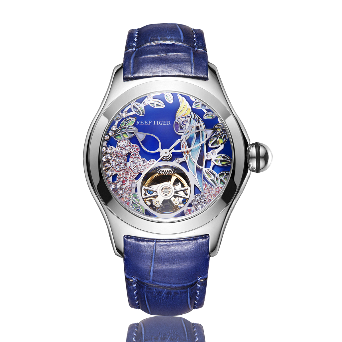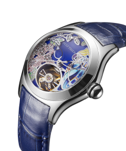 藍(lán)色表盤,帶鸚鵡圖案標(biāo)記。時(shí)、分、秒顯示。這款奢華腕表的表盤 12 點(diǎn)鐘位置印有品牌標(biāo)識(shí)。