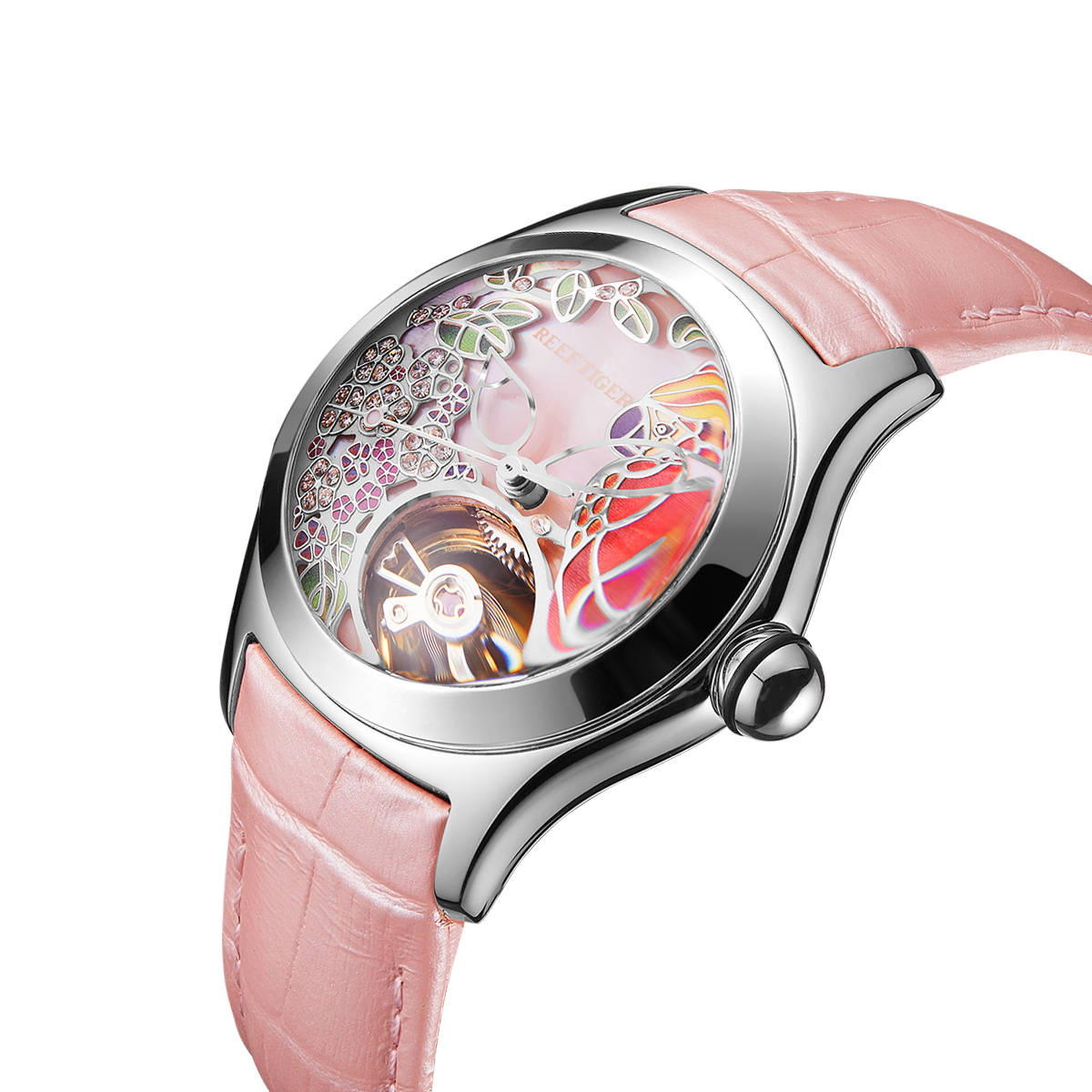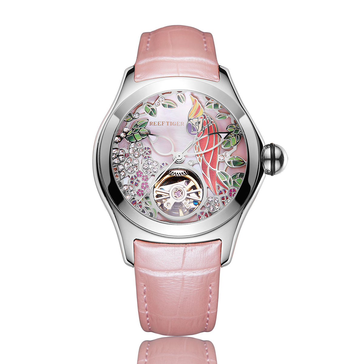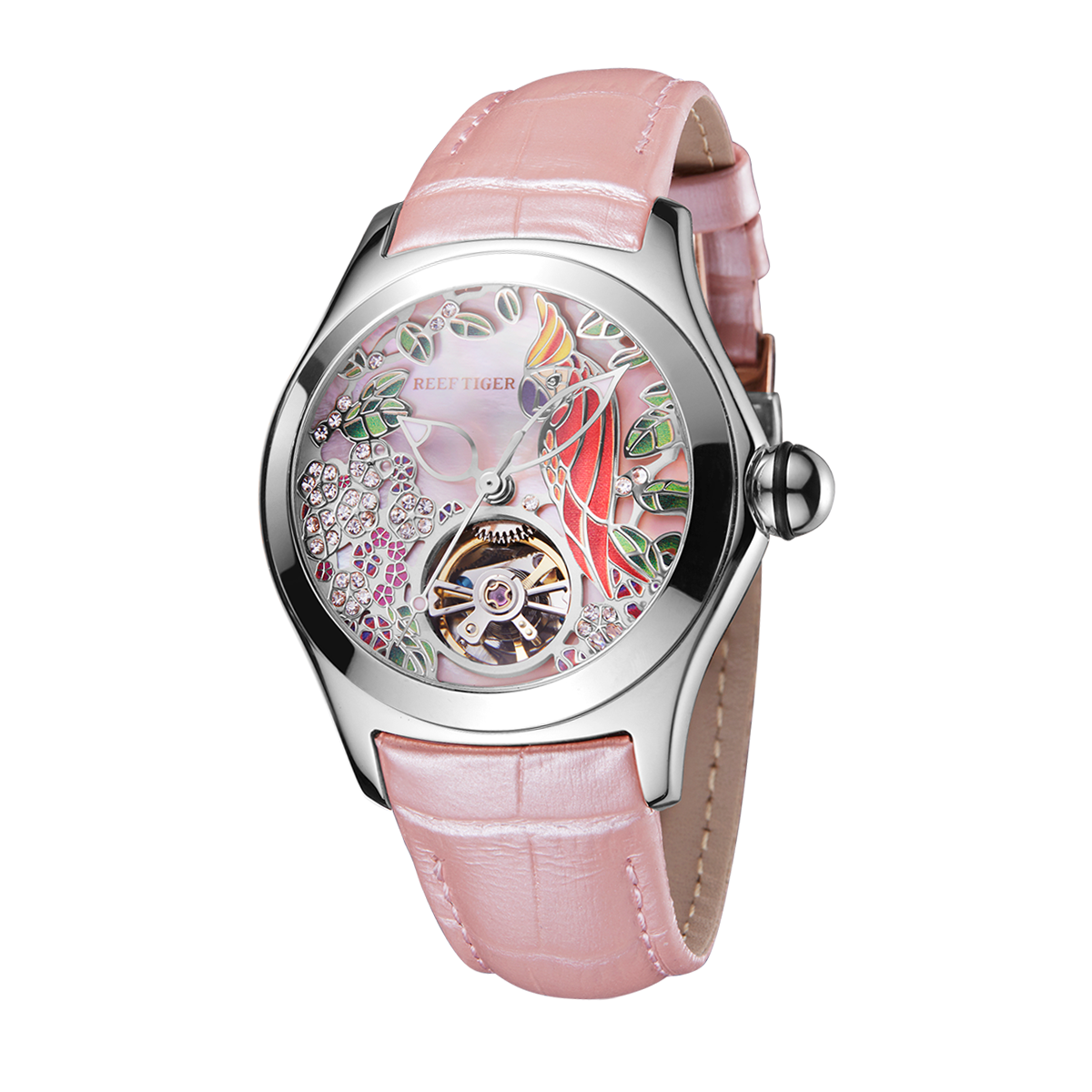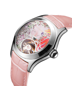 粉色表盤,帶鸚鵡圖案標記。時、分、秒顯示。這款奢華腕表的表盤 12 點鐘位置印有品牌標識。