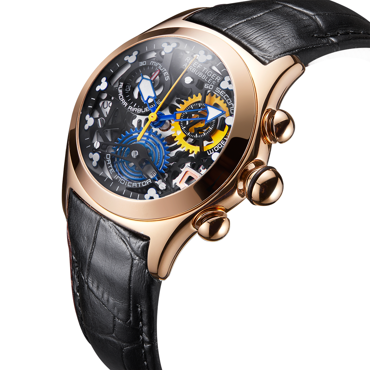 Aurora Ari Bubble 玫瑰金鏤空腕表。耐用的不銹鋼鍍玫瑰金,固定表圈也配有打造專業(yè)外觀的提案和演示。耐用的聚酯前后蓋,協(xié)調(diào)一致。